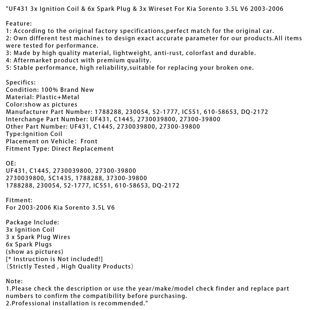 UF431 3x Zündspule & 6x Zündkerze & 3x Kabelsatz Für Kia Sorento 3,5 L V6 2003-2006