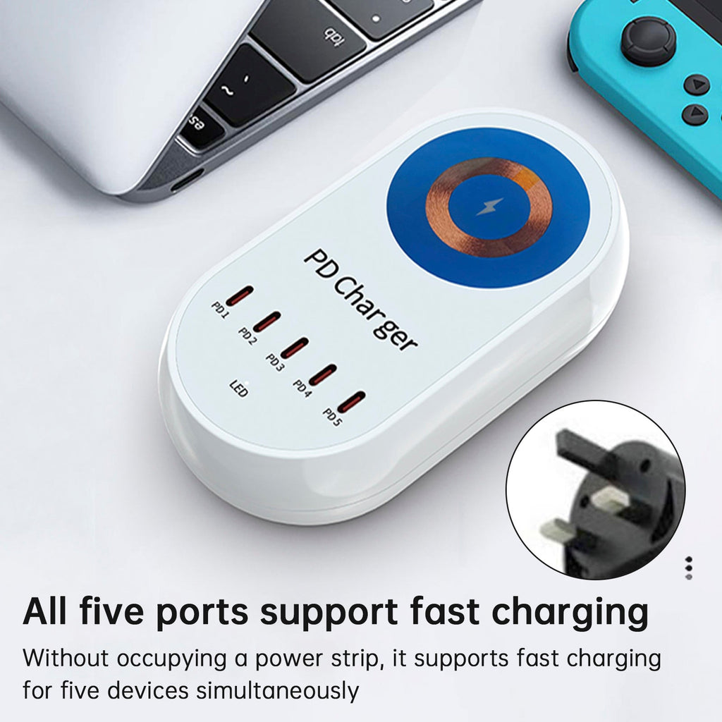 14. Kompatibel mit verschiedenen Geräten, fünf PD-Anschlüsse + ein kabelloses Ladegerät, das mit verschiedenen Geräten kompatibel ist, kann verschiedene Geräte, Mobiltelefone, Tablets, Notebooks, Bluetooth-Headsets aufladen