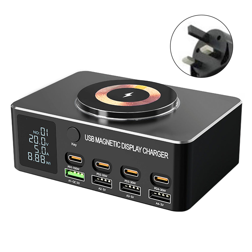 140-W-Schnellladegerät, intelligente Digitalanzeige, PD100W, magnetisches kabelloses Laden, USB-Ladegerät mit mehreren Anschlüssen, UK-Stecker
