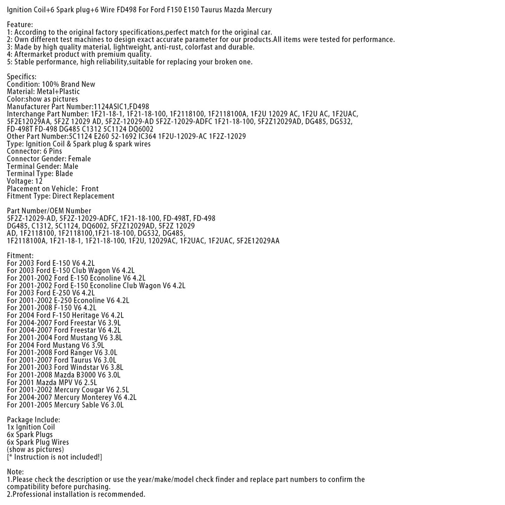 Sytytyspuola + 6 sytytystulppaa + 6 johtoa FD498 Ford F150 E150 Taurus Mazda Mercurylle