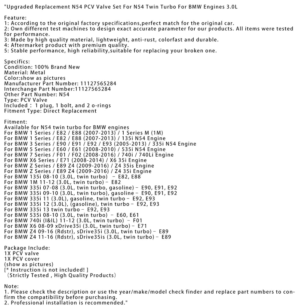 Parannettu PCV-venttiilisarja N54:lle N54 Twin Turbo -malliin BMW 3.0L -moottoreille