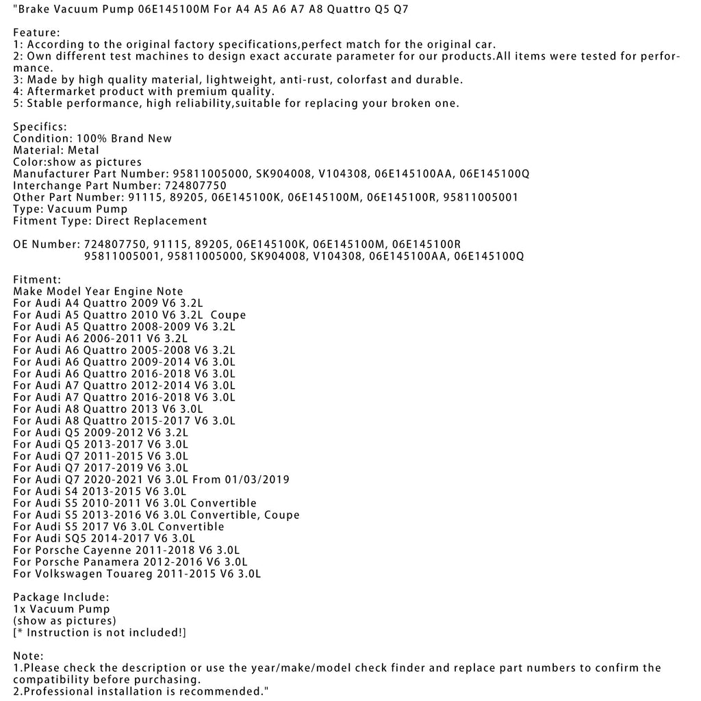 Jarrutyhjiöpumppu 06E145100M A4 A5 A6 A7 A8 Quattro Q5 Q7