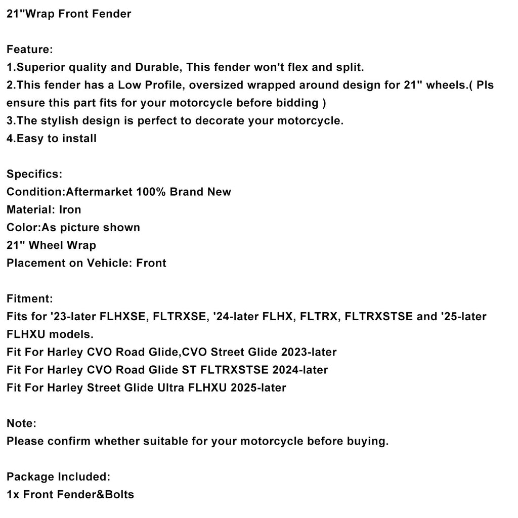 2. Dieser Kotflügel hat ein niedriges Profil und ein übergroßes, umlaufendes Design für 21-Zoll-Räder. (Bitte stellen Sie vor dem Kauf sicher, dass dieses Teil zu Ihrem Motorrad passt.)