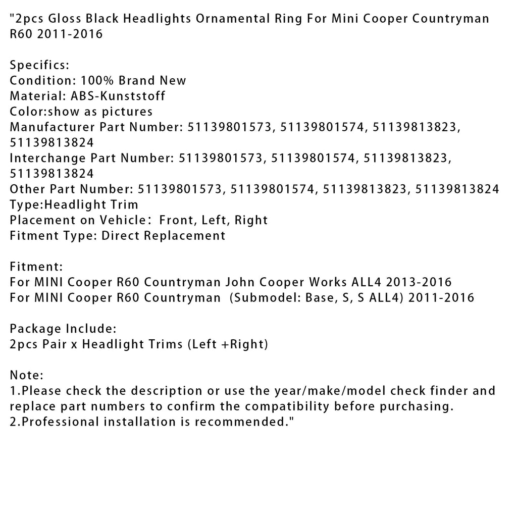2 kpl kiiltävän mustaa ajovalon koristerengasta Mini Cooper Countryman R60 2011-2016 -malliin