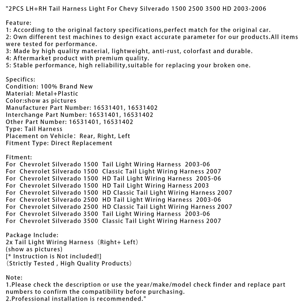 2 Stück Rücklichtkabelbaum links + rechts für Chevy Silverado 1500 2500 3500 HD 2003-2006