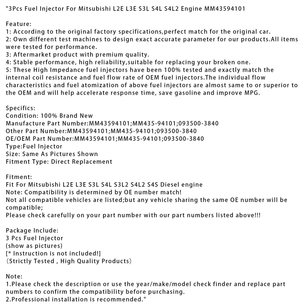 3 Stück Kraftstoffeinspritzdüsen für Mitsubishi L2E L3E S3L S4L S4L2 Motor MM43594101