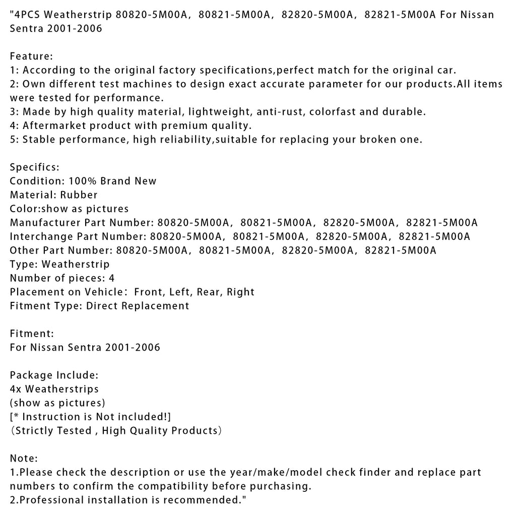 4 Stück Dichtungsstreifen 80820-5M00A, 80821-5M00A, 82820-5M00A, 82821-5M00A für Nissan Sentra 2001-2006