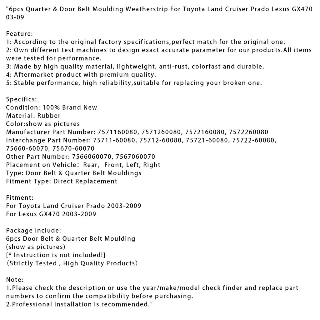 6 stücke Viertel & Tür Gürtel Moulding Weathers Für Toyota Land Cruiser Prado Lexus GX470 2003-2009
