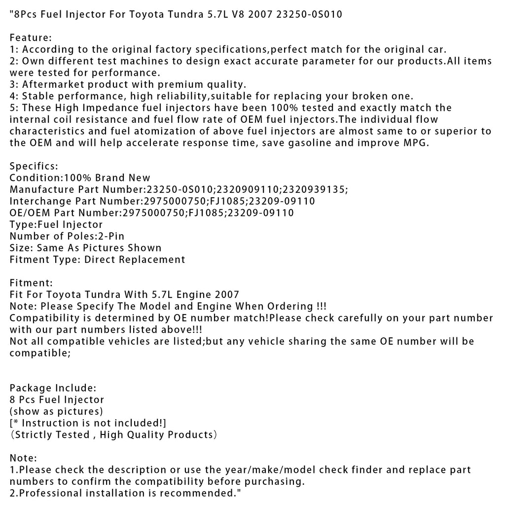 8 Stück Kraftstoffeinspritzdüsen passend für Toyota Tundra 5.7L V8 2007 23250-0S010