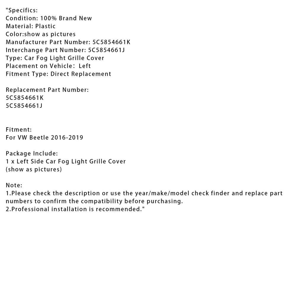 Auton vasemmanpuoleisen sumuvalon säleikön suojus 5C5854661K VW Beetlelle 2016-2019