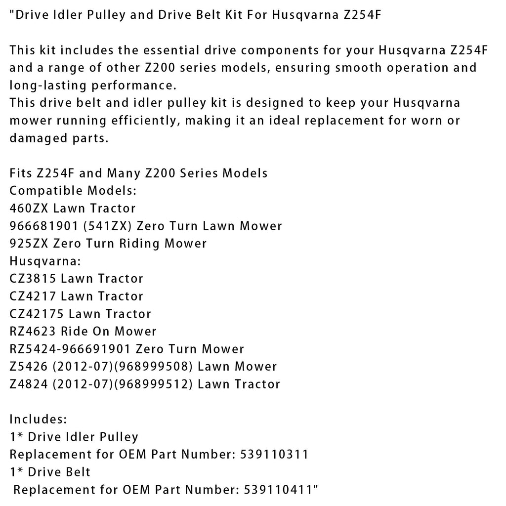 Drive Idler Pulley and Drive Belt Kit For Husqvarna Z254F