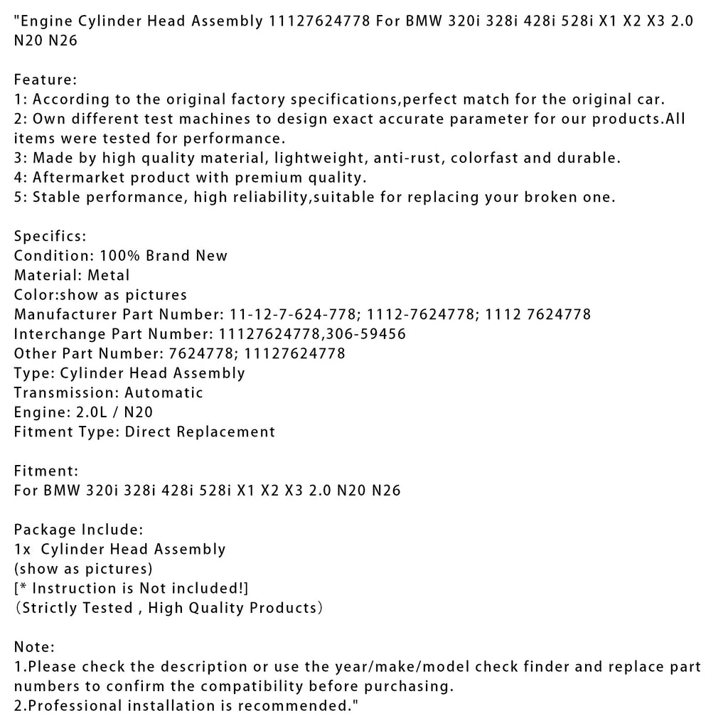 Zylinderkopf-Baugruppe 11127624778 Passend für BMW 320i 328i 428i 528i X1 X2 X3 2.0 N20 N26