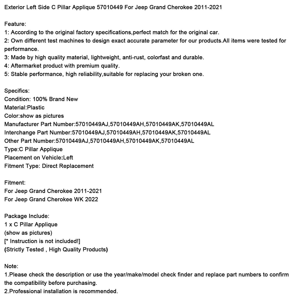 Äußere linke C-Säulen-Applikation 57010449 für Jeep Grand Cherokee 2011-2021