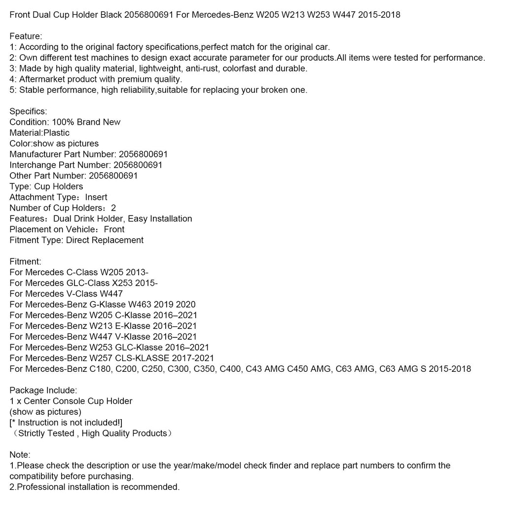 Vorne Dual Tasse Halter Schwarz 2056800691 Für Mercedes-Benz W205 W213 W253 W447 2015-2018