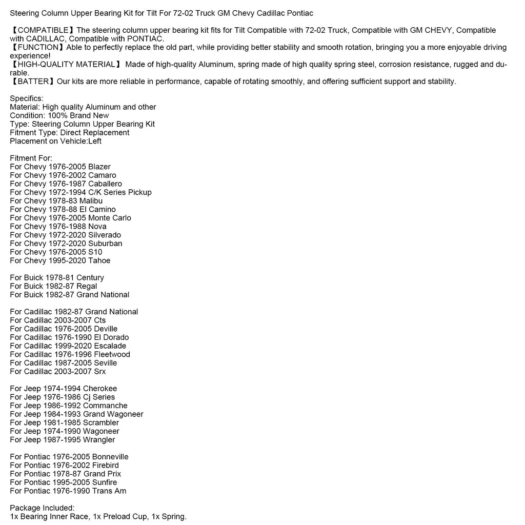 【KOMPATIBEL】 Das obere Lenksäulenlager-Kit passt für Tilt. Kompatibel mit 72-02 Truck, kompatibel mit GM CHEVY, kompatibel mit CADILLAC, kompatibel mit PONTIAC.