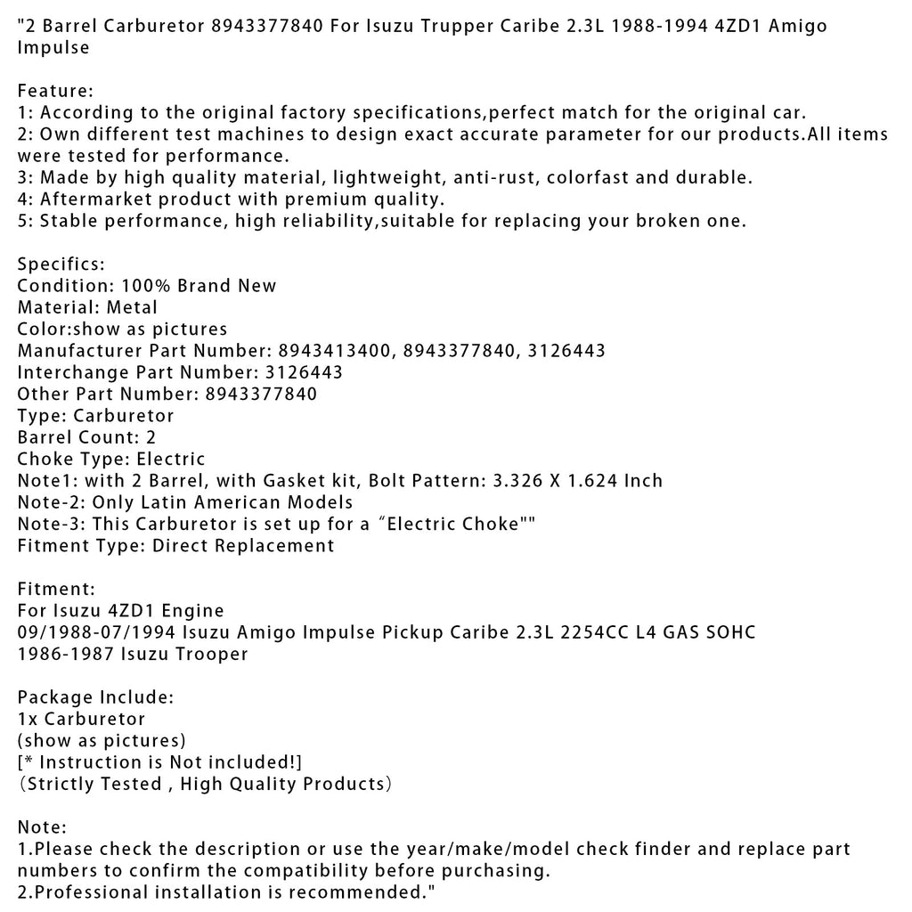 2-Zylinder-Vergaser 8943377840 für Isuzu Trupper Caribe 2.3L 1988–1994 4ZD1 Amigo Impulse