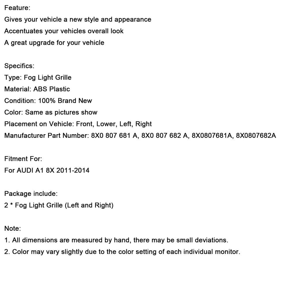 2 stk. tåkelysgrill, støtfangerdeksel, passer til Audi A1 8X 2011-2014