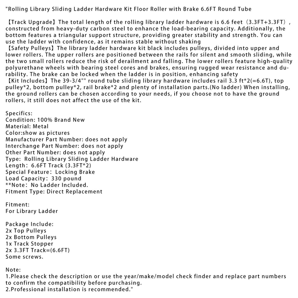 【Settet inkluderer】 39-3/4""Rundrørs skyvebibliotekutstyr inkluderer en 3,3 fot * 2 (= 6,6 tonn) skinne, et øvre hjul * 2, et nedre hjul * 2, en skinnebrems * 2 og en rekke installasjonsdeler. (Ingen stige) Under installasjonen kan gulvhjulene velges i henhold til dine behov. Hvis du velger å ikke bruke gulvhjulene, vil det fortsatt ikke påvirke bruken av settet."