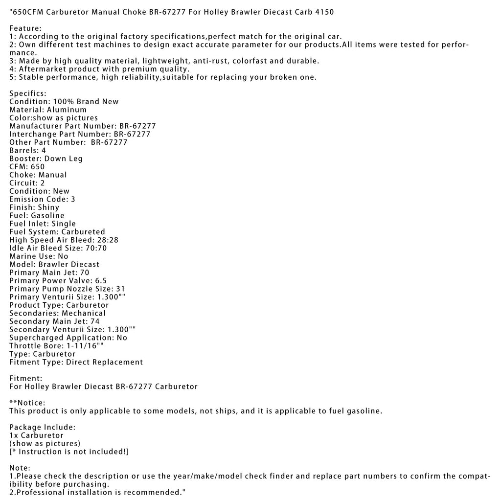 650CFM forgasser manuell choke BR-67277 For Holley Brawler Diecast Carb 4150