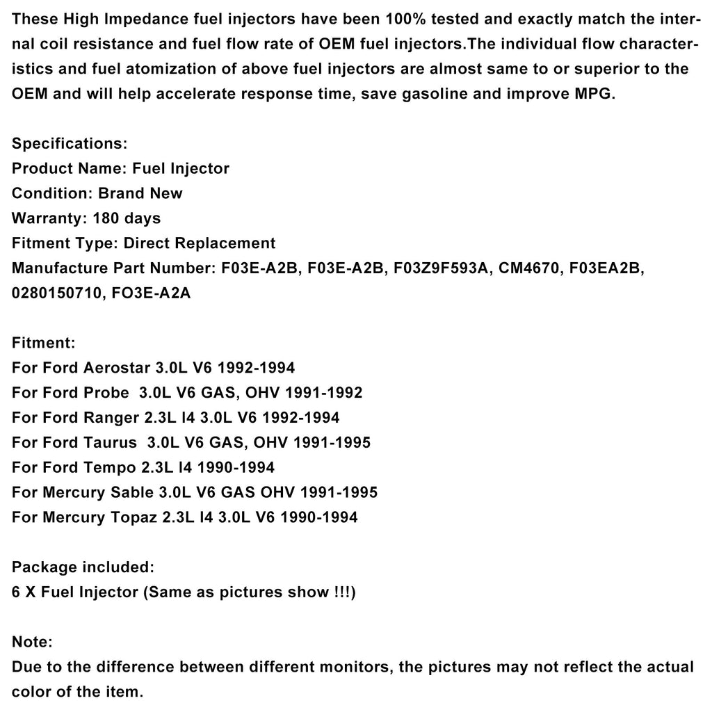6PCS Kraftstoff Injektor CM4670 Fit Ford Ranger 2,9 L 3,0 L 3,8 L V6 1985-1997 F03E-A2B