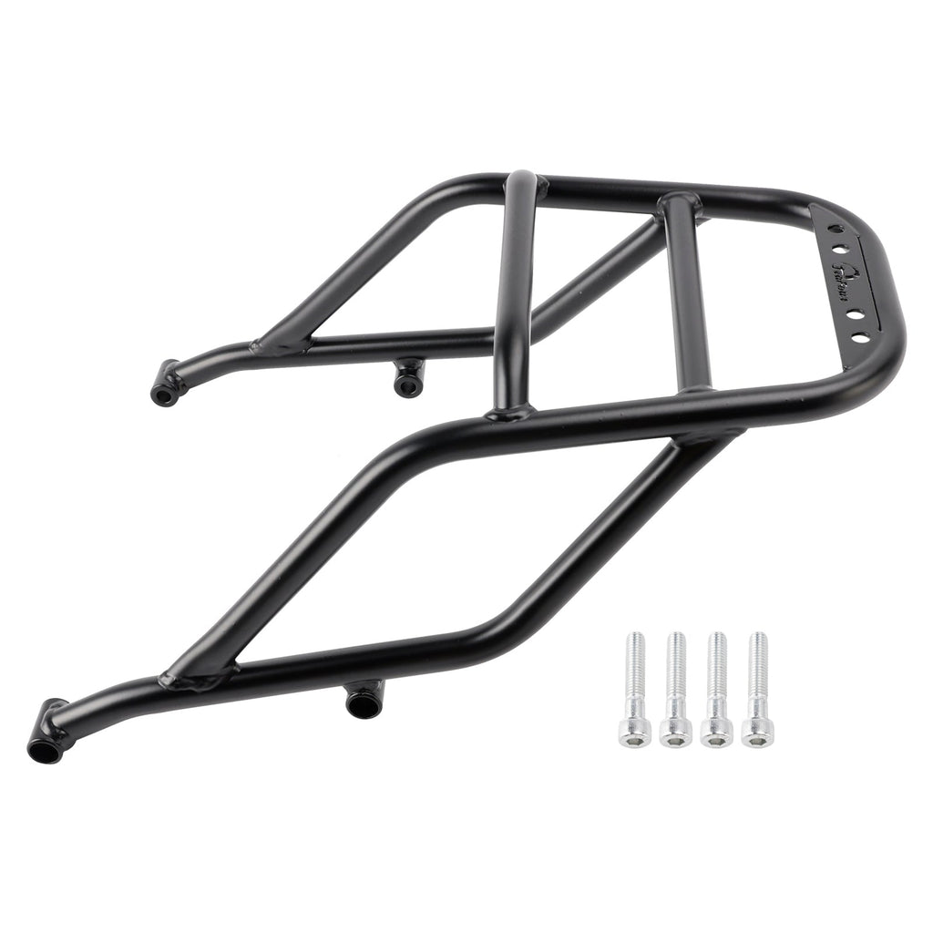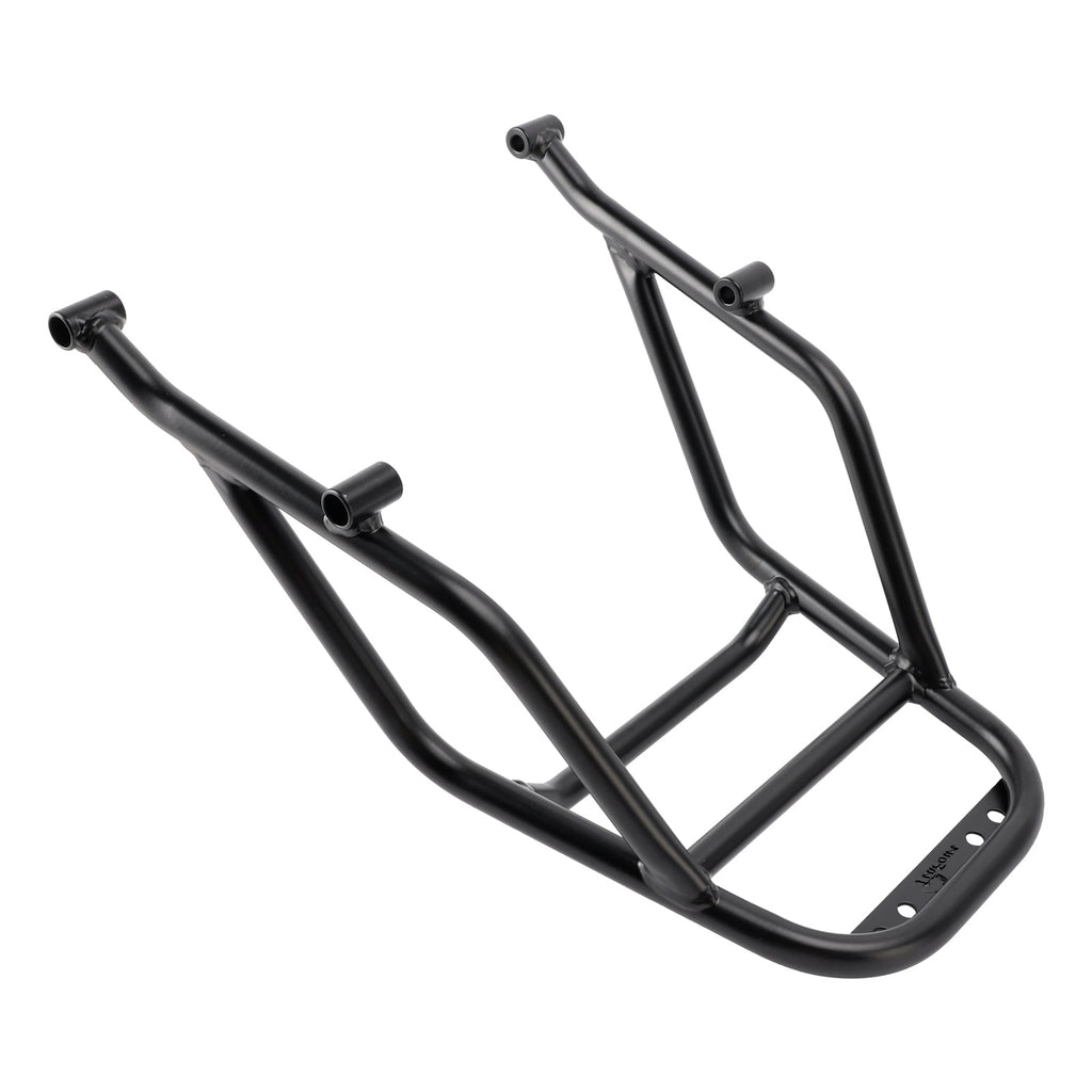 Unser robustes, querverstrebtes Gepäckträgersystem fungiert als zusätzlicher Hilfsrahmen, verstärkt das Heck des Motorrads und fungiert als hinterer Sturzbügel.