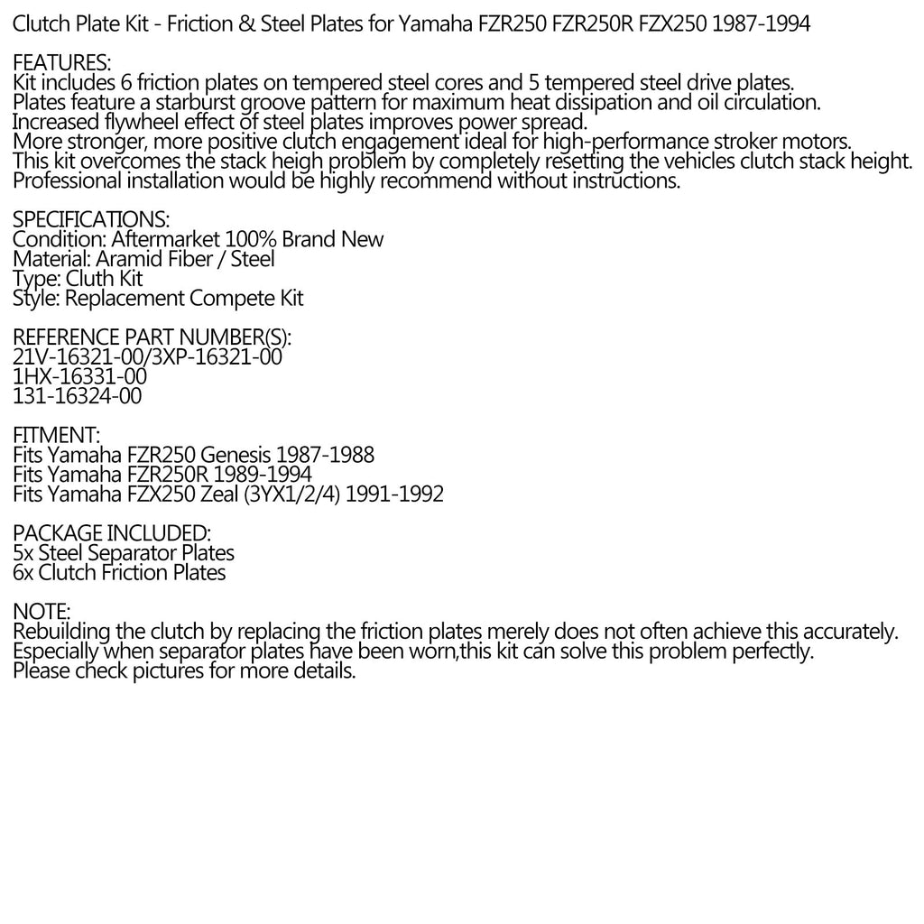 Clutchplatesett - friksjons- og stålplater for Yamaha FZR250 FZR250R FZX250 1987-1994