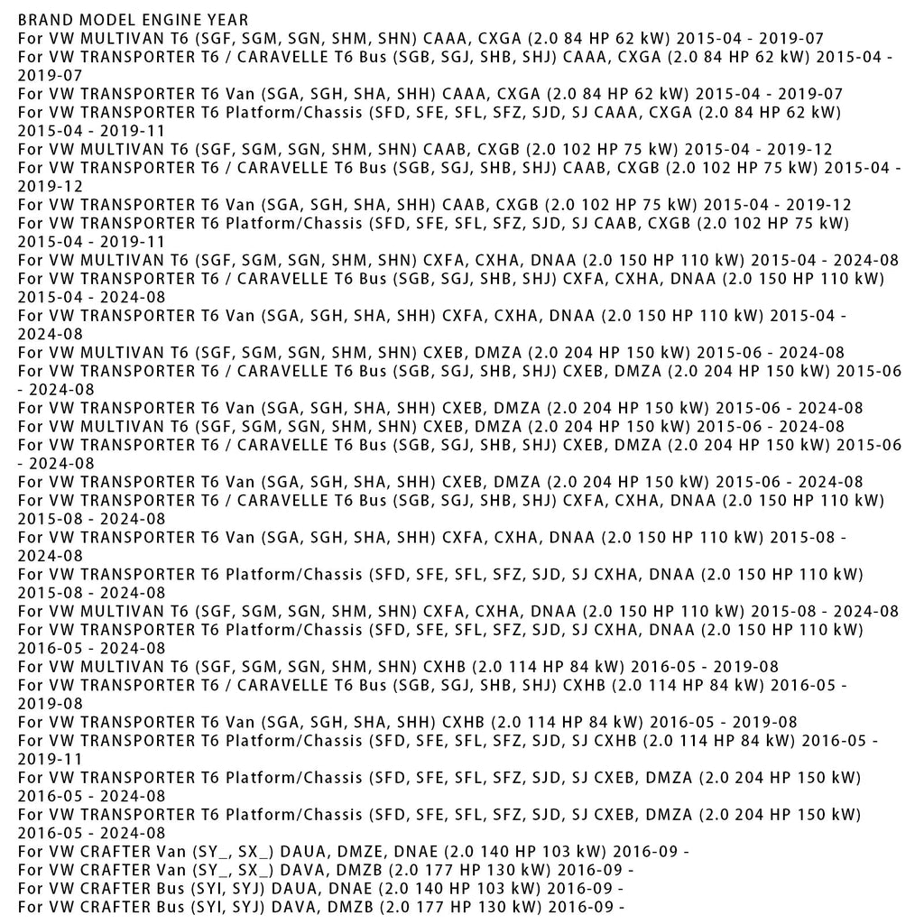 Für VW Crafter / Multivan T6 / Transporter T6 / Grand California Camper 2.0l 16V TDI: CXFA, CXGA, CXGB, CXGD, CXHA, CXHB, CXHC, CXEB, CXEC, DASA, DASB, DASC, DAUA, DAUB, DAVA, DAWA, DNAA