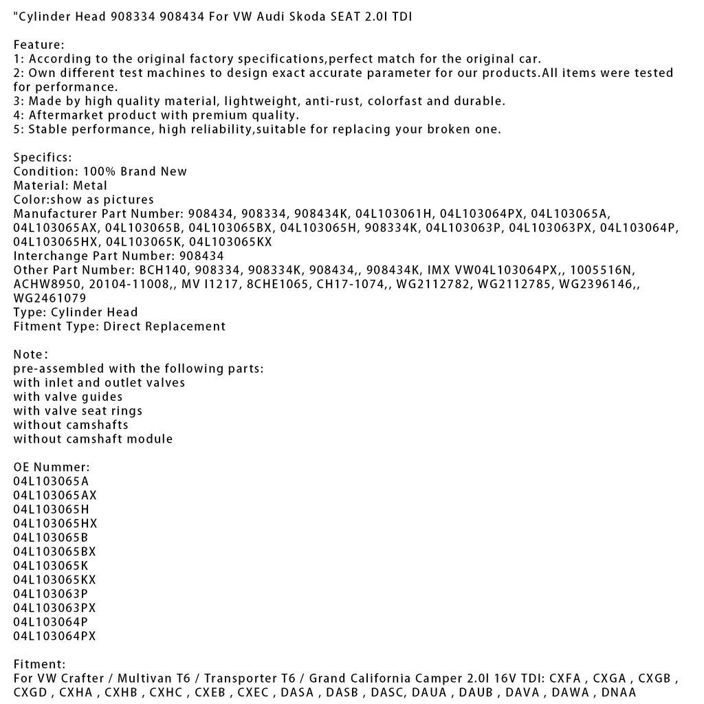 Zylinderkopf 908334 908434 Für VW Audi Skoda SITZ 2.0l TDI