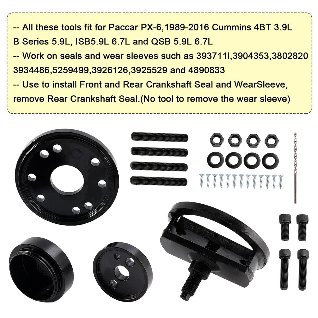 Fremre og bakre veivakseltetningsfjerner og monteringssett med monteringssett for slitasjehylse for Cummins 3.9L, 5.9L, 6.7L 1989-2016 Erstatter 1338 3824498 5046 3824500 31646060 38246060 ST-824060 3524060 3524060 3524060 3524 090