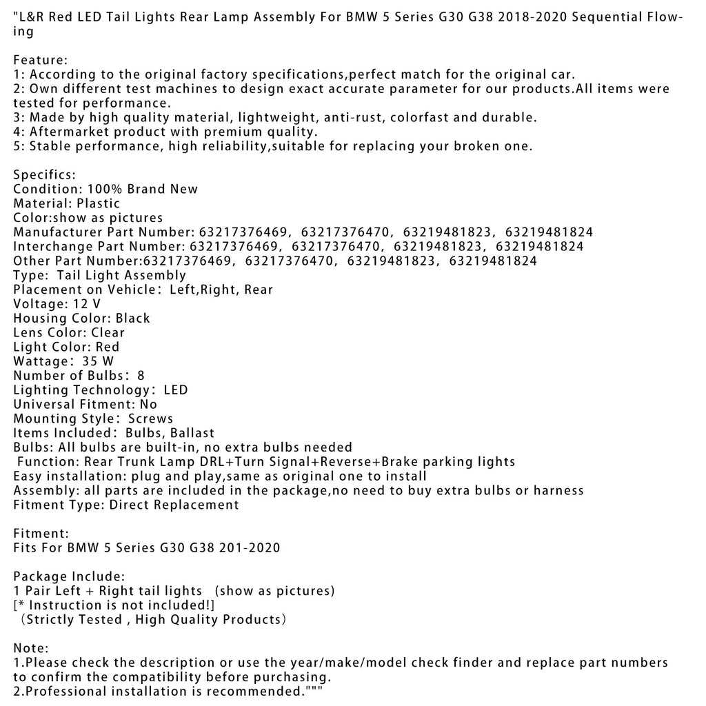 Røde LED-baklykter, venstre og høyre, baklyktenhet for BMW 5-serie G30 G38 2018-2020, sekvensiell flyt