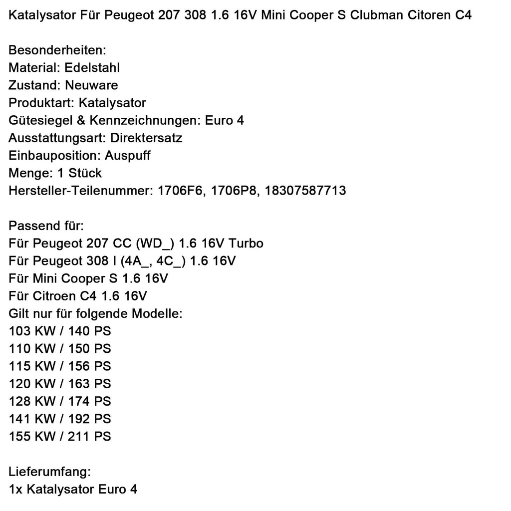Catalytic Converter for Peugeot 207 308 1.6 16V Mini Cooper S Clubman Citroen C4