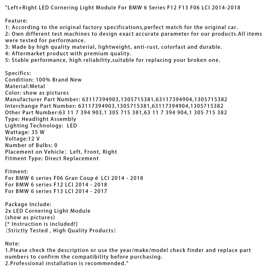 2014–2017 BMW 6er F13 LCI Links + Rechts LED-Kurvenlichtmodul 63117394903 1305715381