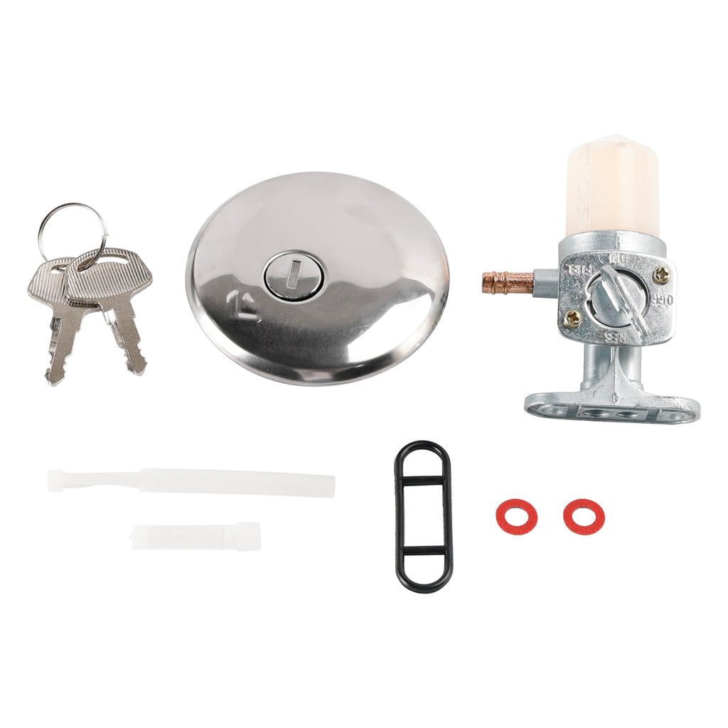 W zestawie chromowany korek wlewu paliwa z kluczykami i kranik do stosowania z przewodem paliwowym o średnicy 1/4 cala.