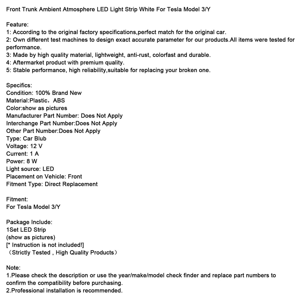Front Trunk Ambient Atmosphere LED Light Strip White For Tesla Model 3/Y