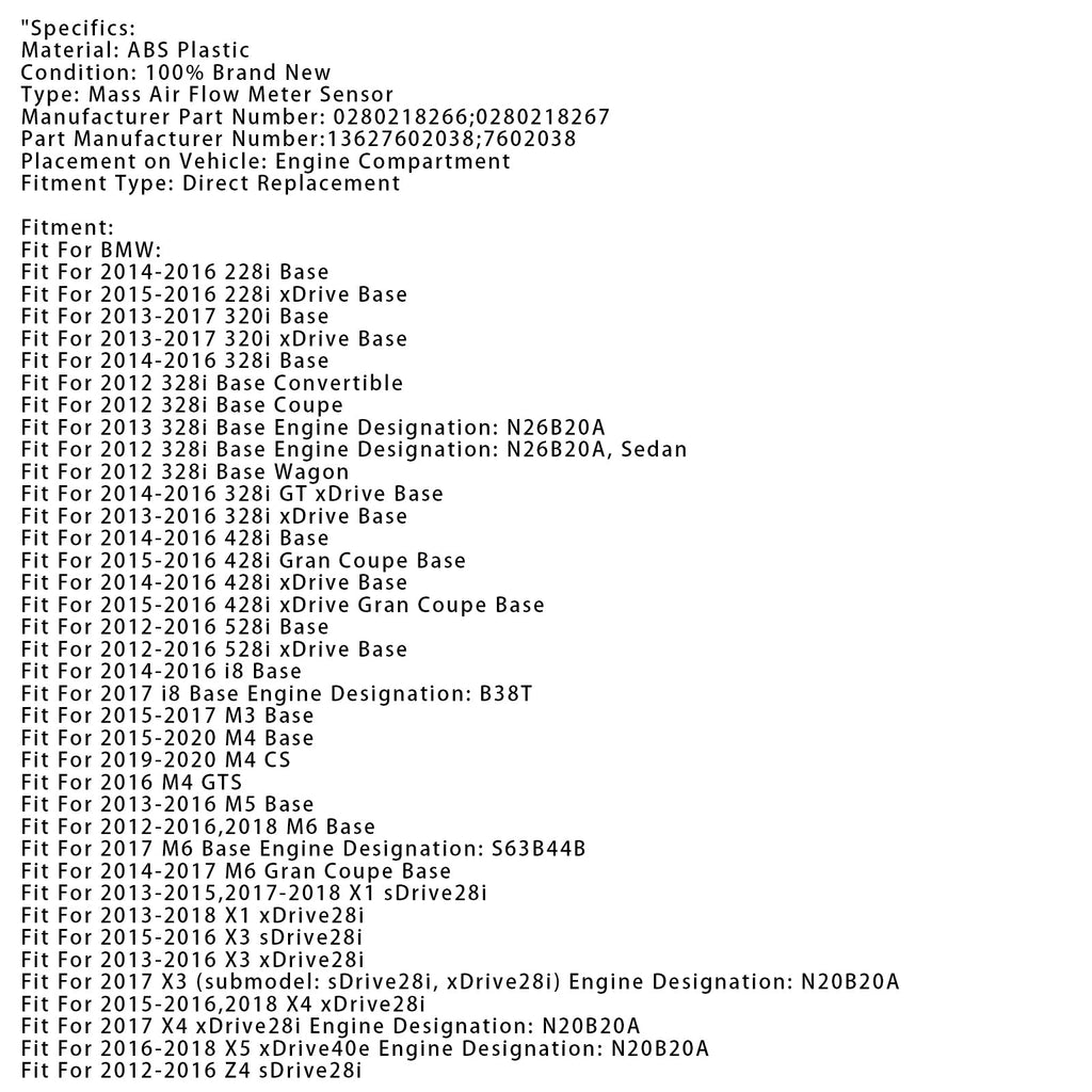 Mass Air Flow Meter Sensor For BMW F30 F10 X1 320i 328i 528i 0280218266
