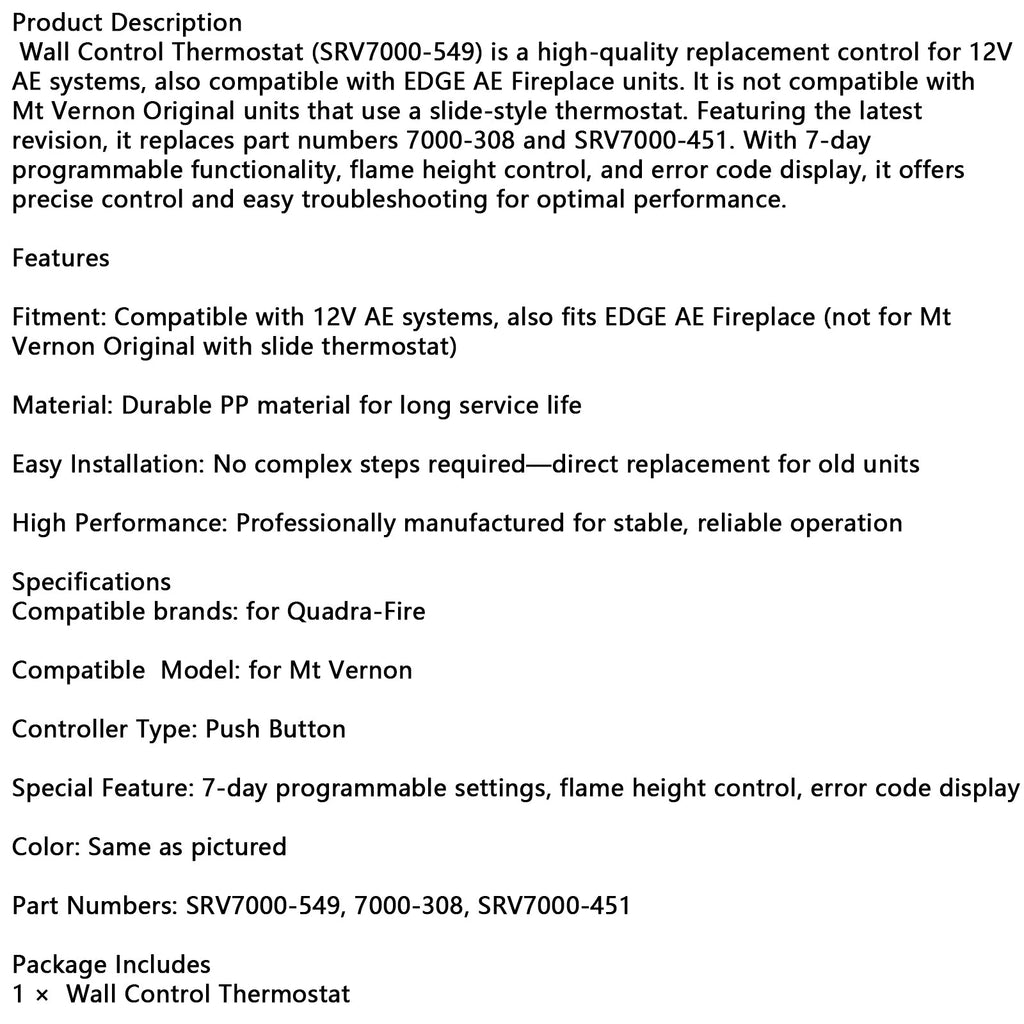 Der Wandthermostat (SRV7000-549) ist ein hochwertiger Ersatzregler für 12-V-AE-Systeme und auch kompatibel mit EDGE AE-Kamingeräten. Er ist nicht kompatibel mit Mt Vernon Originalgeräten mit Schiebethermostat. Mit der neuesten Version ersetzt er die Teilenummern 7000-308 und SRV7000-451. Mit 7-Tage-Programmierfunktion, Flammenhöhenregelung und Fehlercodeanzeige bietet er präzise Steuerung und einfache Fehlerbehebung für optimale Leistung.