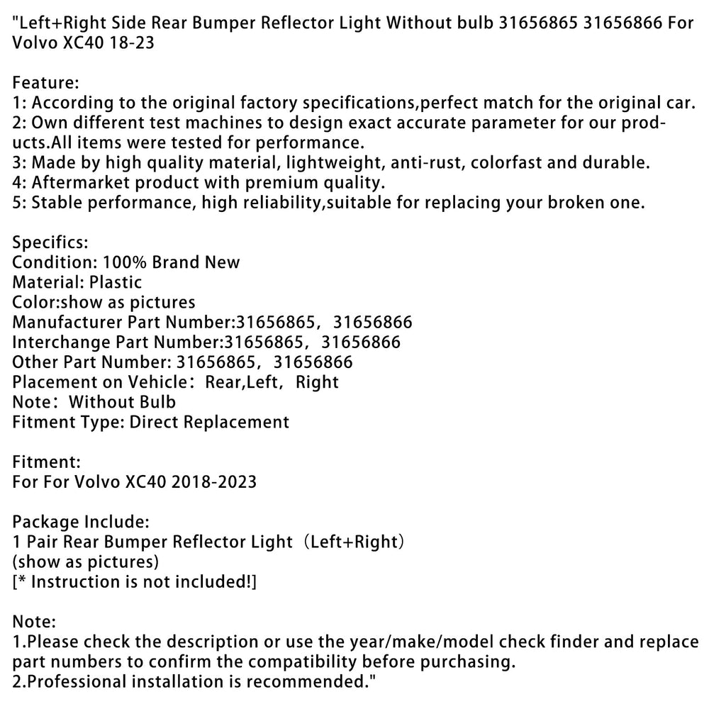 Światło odblaskowe lewego i prawego tylnego zderzaka Bez żarówki 31656865 31656866 Firma Volvo posiada różne maszyny testujące w celu opracowania dokładnych i precyzyjnych parametrów naszych produktów. Wszystkie elementy zostały przetestowane pod kątem wydajności.