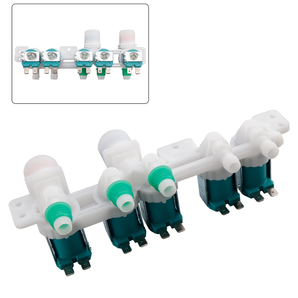 Zasada działania: Zawór wlotowy wody DC97-15459G ma dwa gwintowane przyłącza umożliwiające podłączenie do węży z ciepłą i zimną wodą pralki. Zawory elektromagnetyczne sterują każdym przyłączem i otwierają i zamykają przepływ wody w zależności od ustawionej temperatury prania i sygnału poziomu wody.