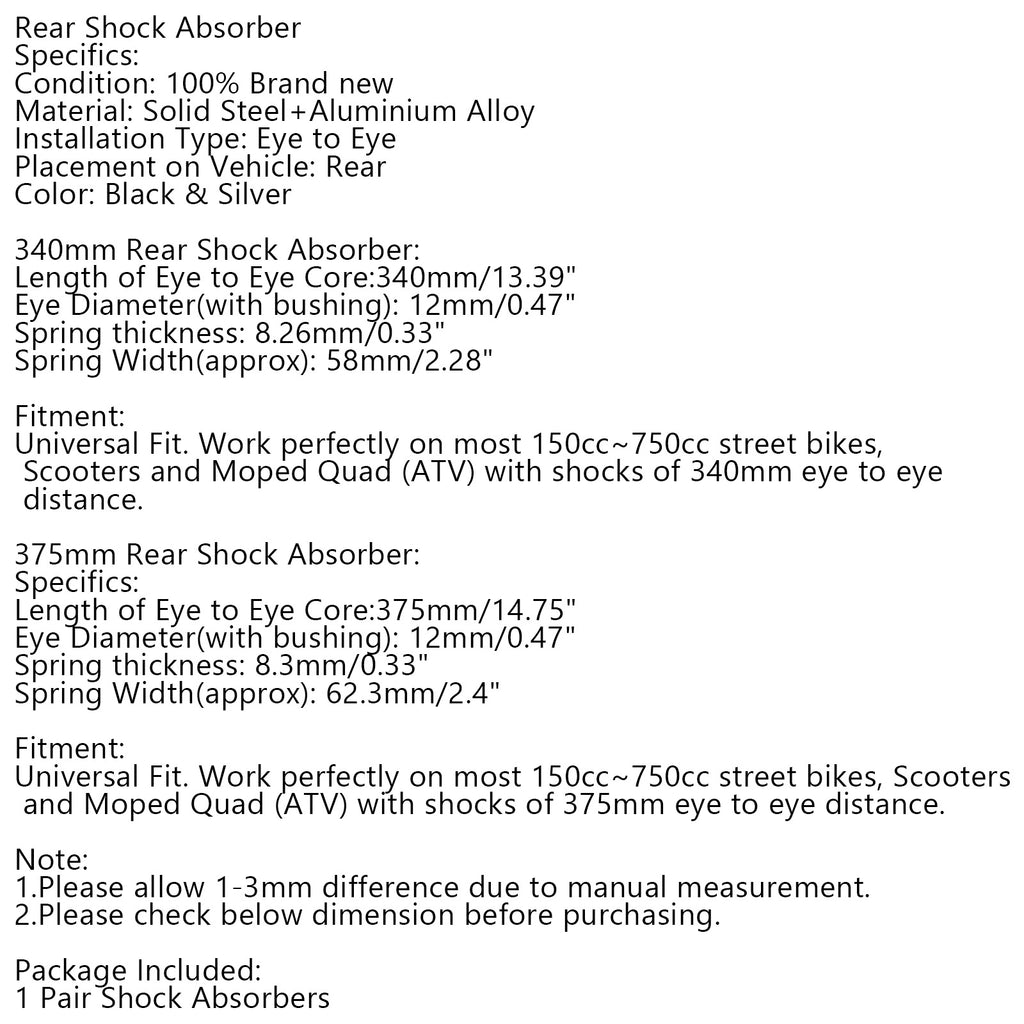 angielski Amortyzatory tylne Funkcja: 1: Zmniejszenie nierówności podczas jazdy, dzięki czemu jazda jest wygodniejsza i bardziej stabilna. 2: Wysoka jakość i bardzo trwałe. 3: brak instrukcji instalacji, łatwy w instalacji. Amortyzatory tylne 340mm: Szczegóły: Stan: 100% nowy Materiał: lita stal + stop aluminium Typ instalacji: Oko w oko Długość rdzenia oko w oko: 340 mm/13.39" Średnica oka (z tuleją): 12mm/0.47" Grubość sprężyny: 8.26mm/0.33" Szerokość sprężyny (w przybliżeniu): 58mm/2.28" Umieszczenie na pojeździe: Tył Kolor: czarny i srebrny Montaż: Uniwersalne dopasowanie. Idealnie współpracuje z większością motocykli ulicznych o pojemności 150 cm3 ~ 750 cm3, skuterów i motorowerów Quad (ATV) z amortyzatorami o odległości 340 mm oko w oko. Świetny wybór do wymiany, modernizacji stylu i wszelkiego rodzaju modyfikacji roweru. Amortyzatory tylne 375 mm: Szczegóły: Stan: 100% nowy Materiał: lita stal + stop aluminium Typ instalacji: Oko w oko Długość rdzenia oko w oko: 375mm/14.75" Średnica oka (z tuleją): 12mm/0.47" Grubość sprężyny: 8.3mm/0.33" Szerokość sprężyny (w przybliżeniu): 62.3mm/2.4" Umieszczenie na pojeździe: Tył Kolor: czarny i srebrny Montaż: Uniwersalne dopasowanie. Doskonale współpracuje z większością motocykli ulicznych, skuterów i motorowerów o pojemności 150 cm3 ~ 750 cm3 (ATV) z amortyzatorami o odległości 375 mm oko w oko. Świetny wybór do wymiany, modernizacji stylu i wszelkiego rodzaju modyfikacji roweru. Notatka: 1.Proszę pozwolić na różnicę 1-3mm ze względu na pomiary ręczne. 2Przed zakupem proszę sprawdzić poniższe wymiary. Pakiet zawiera: 1 para amortyzatorów niemiecki Amortyzator tylny Funkcja: 1: Zmniejszanie nierówności podczas jazdy, aby jazda była wygodniejsza i stabilniejsza. 2: Wysoka jakość i bardzo trwałe. 3: Brak instrukcji instalacji, łatwy w instalacji. Amortyzator tylny 340 mm: Funkcje specjalne: Stan: 100% nowy Materiał: lita stal + stop aluminium Typ instalacji: oko w oko Długość od oka do rdzenia oka: 340 mm Średnica oka (z oczodołem): 12 mm Grubość sprężyny: 8,26 mm Szerokość sprężyny (w przybliżeniu): 58 mm Umieszczenie na pojeździe: Tył Kolor: czarny i srebrny Sprzęt: Uniwersalne dopasowanie. Doskonale współpracuje z większością motocykli ulicznych, skuterów i quadów motorowerów (ATV) o pojemności od 150 cm3 do 750 cm3 z amortyzatorami o rozstawie 340 mm. Dobry wybór do wymiany, poprawy stylu i wszelkiego rodzaju modyfikacji roweru. Amortyzator tylny 375 mm: Funkcje specjalne: Stan: 100% nowy Materiał: lita stal + stop aluminium Typ instalacji: oko w oko Długość od oka do rdzenia oka: 375 mm Średnica oka (z oczodołem): 12 mm Grubość sprężyny: 8,3 mm Szerokość sprężyny (w przybliżeniu): 62,3 mm/2,4 cala Umieszczenie na pojeździe: Tył Kolor: czarny i srebrny Sprzęt: Uniwersalne dopasowanie. Doskonale współpracuje z większością motocykli ulicznych, skuterów i quadów motorowerów (ATV) o pojemności od 150 cm3 do 750 cm3 z amortyzatorami o rozstawie 375 mm. Dobry wybór do wymiany, poprawy stylu i wszelkiego rodzaju modyfikacji roweru. Uwaga: 1.Proszę pozwolić na różnicę 1-3mm ze względu na pomiary ręczne. 2Przed zakupem proszę sprawdzić pomiar poniżej. Zawartość dostawy: 1 para amortyzatorów