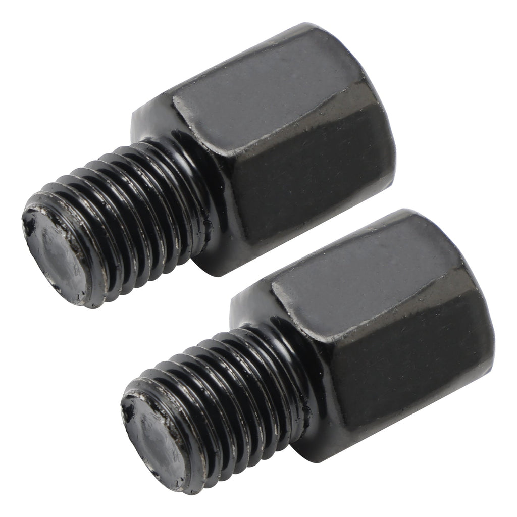 Paar schwarze Motorradspiegeladapter aus Metall.