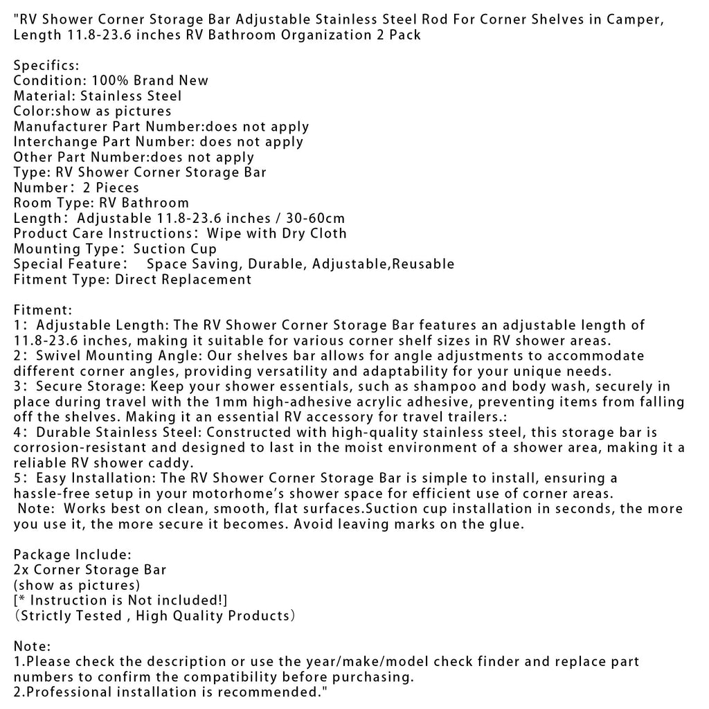 1:Adjustable Length: The RV Shower Corner Storage Bar features an adjustable length of 11.8-23.6 inches, making it suitable for various corner shelf sizes in RV shower areas.