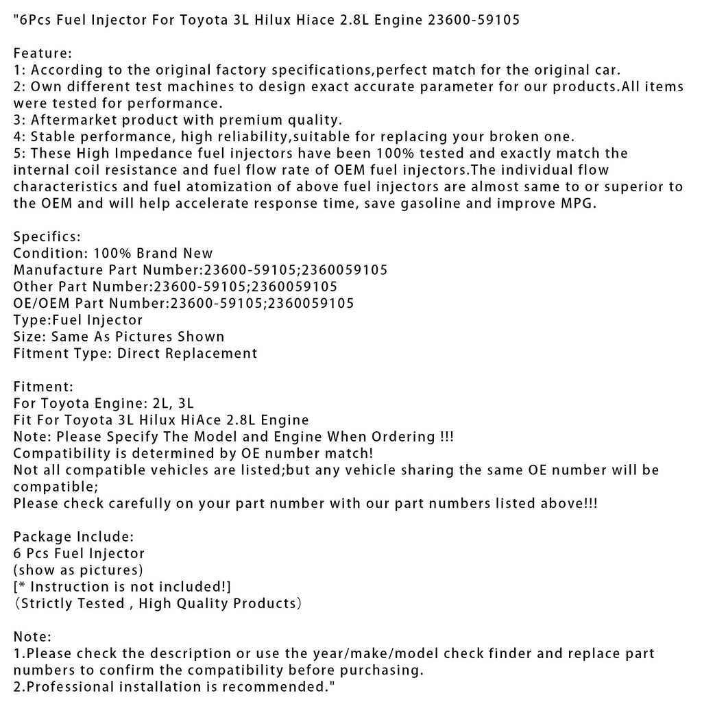 6 Stück Kraftstoffeinspritzdüsen für Toyota 3L Hilux Hiace 2.8L Motor 23600-59105
