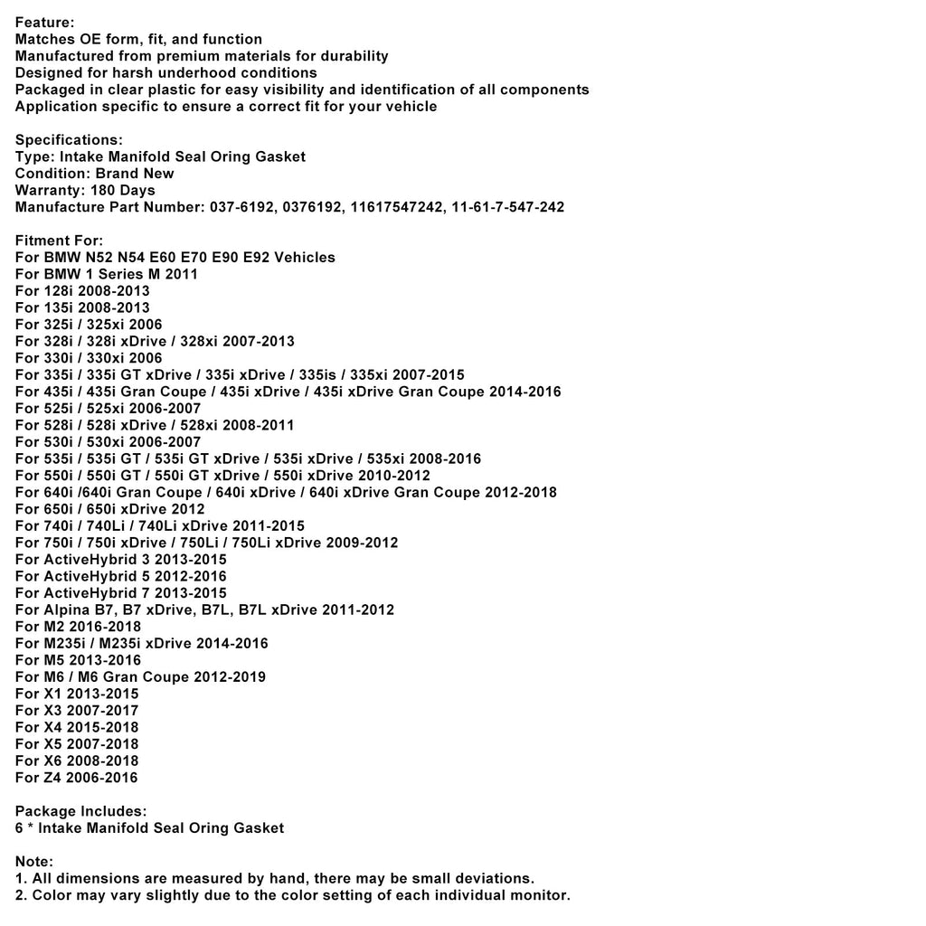 6PCS Ansaugkrümmer Dichtungssatz 037-6192 Fit BMW E70 E90 E92 X4 X5 X6 3er 5er