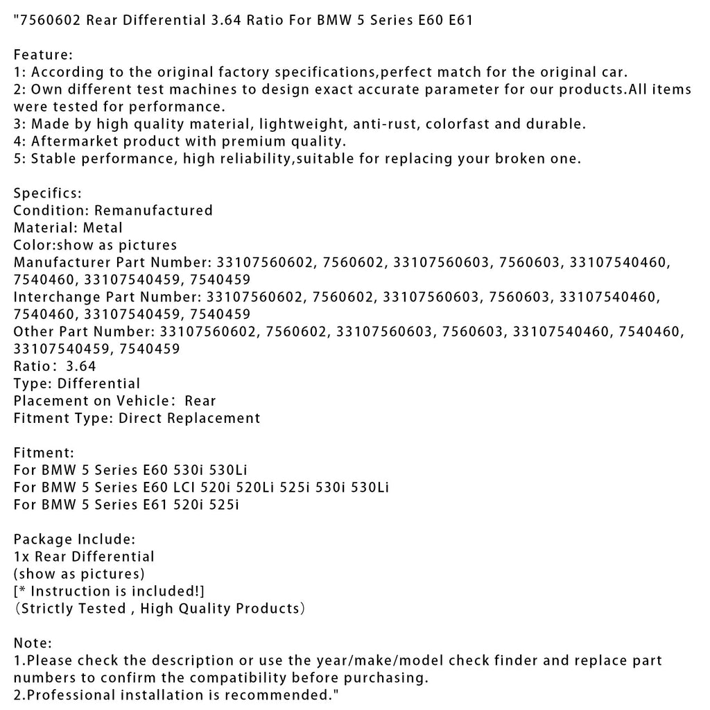 7560602 Rear Differential 3.64 Ratio For BMW 5 Series E60 E61