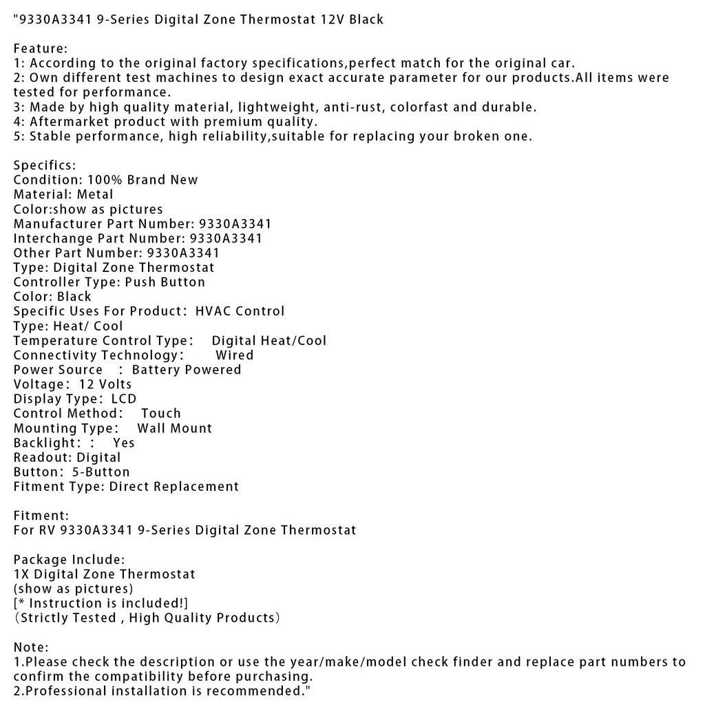 9330A3341 Digitaler Zonenthermostat der 9er-Serie, 12 V, Schwarz