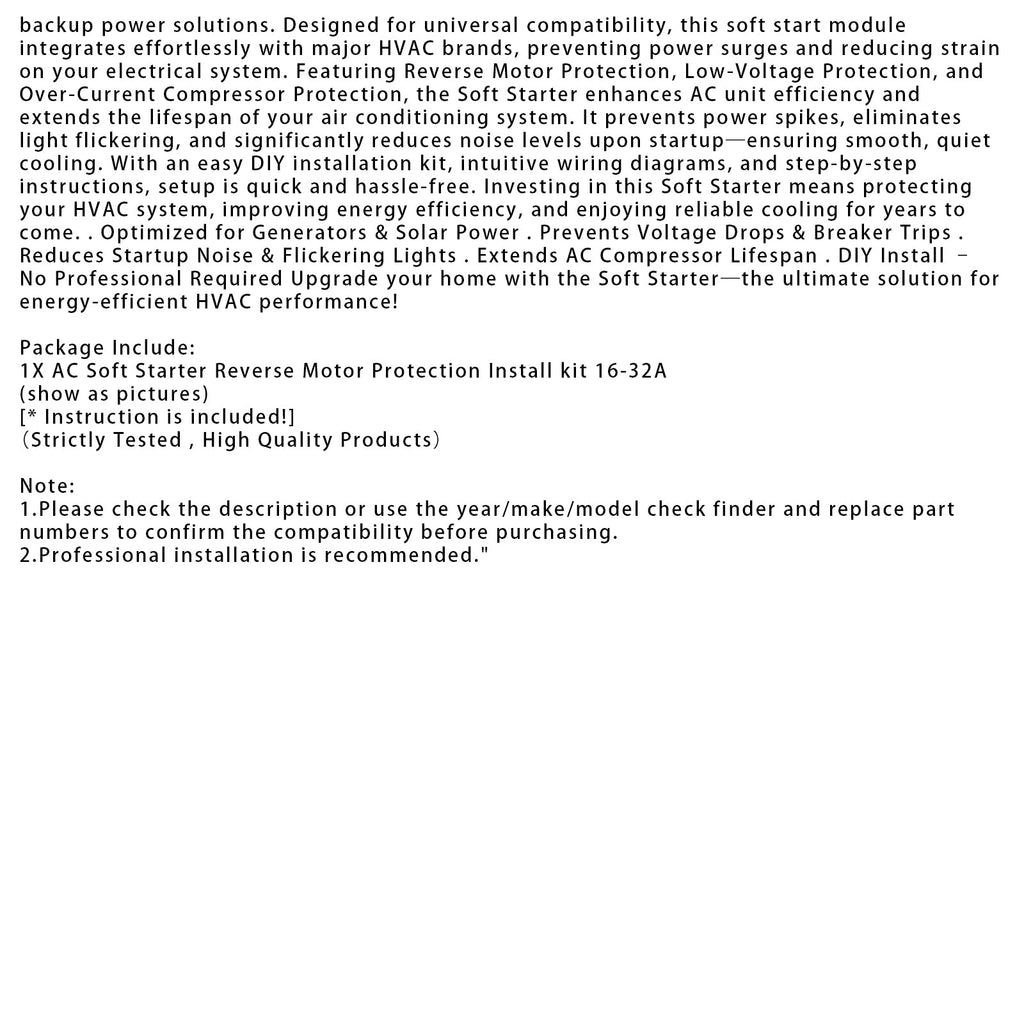 1: SOFTSTART-TECHNOLOGIE: Lässt den Kompressor der Klimaanlage sanft hochfahren, um die Lebensdauer des Geräts durch Reduzierung der Belastung beim Start zu verlängern. :2: GROSSE KOMPATIBILITÄT: 2: Funktioniert mit den meisten Wohn-Klimaanlagen zwischen 1,75 und 3,5 Tonnen