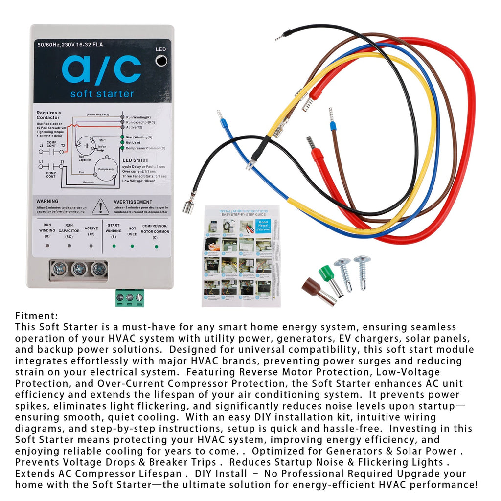 AC-Sanftanlaufgerät, Rücklaufschutz für den Motor, einfaches DIY-Installationskit, passt in den kompakten AC-Überspannungsschutz und Motorschutz, ideal für HVAC-Generatoren und Netzstrom (16–32 A + Installationskit).