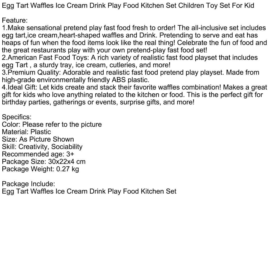 1. Bereiten Sie sensationelles Fast Food frisch auf Bestellung zu! Das All-inclusive-Set enthält Eierkuchen, Eiscreme, herzförmige Waffeln und ein Getränk. Servieren und Essen macht riesigen Spaß, wenn die Speisen echt aussehen! Genießen Sie den Spaß am Essen und die tollen Restaurants mit Ihrem eigenen Fast-Food-Set!