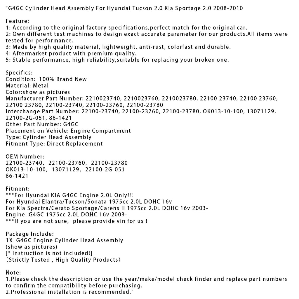 G4GC Zylinderkopf-Baugruppe für Hyundai Tucson 2.0 Kia Sportage 2.0 2008-2010