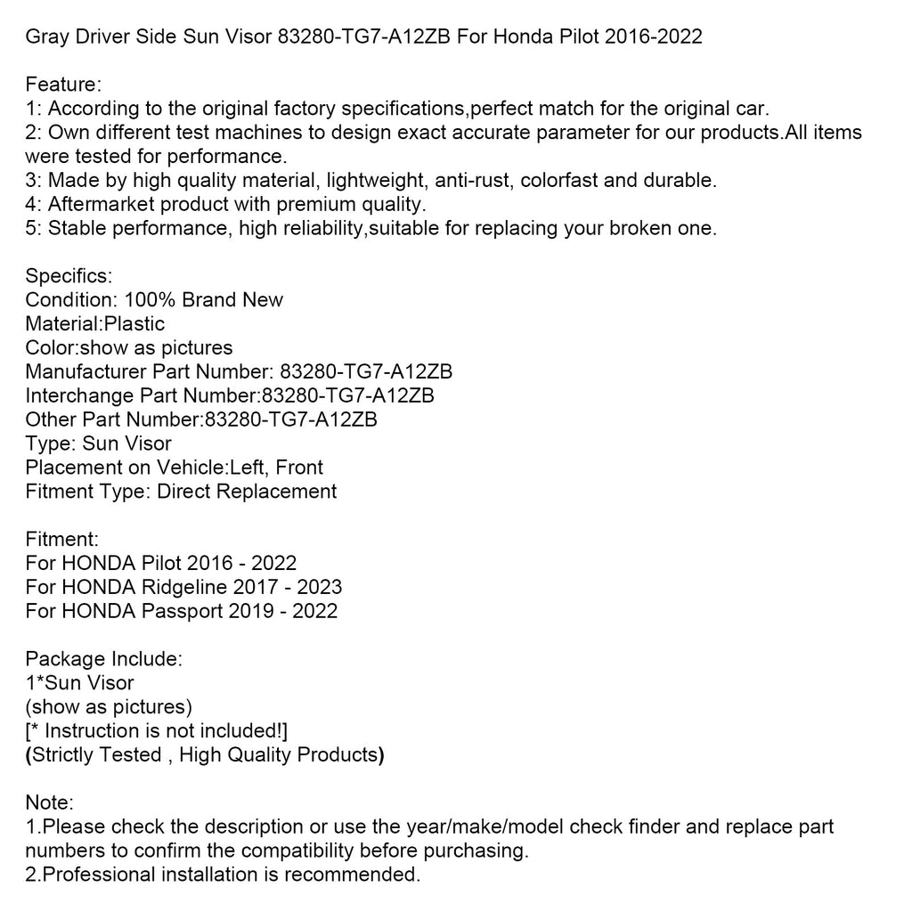 Gray Driver Side Sun Visor 83280-TG7-A12ZB For Honda Pilot 2016-2022